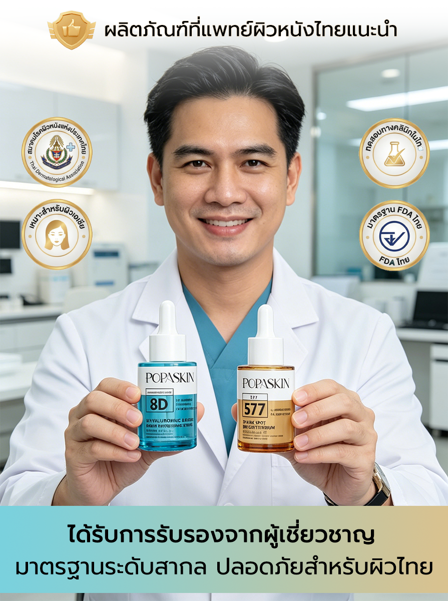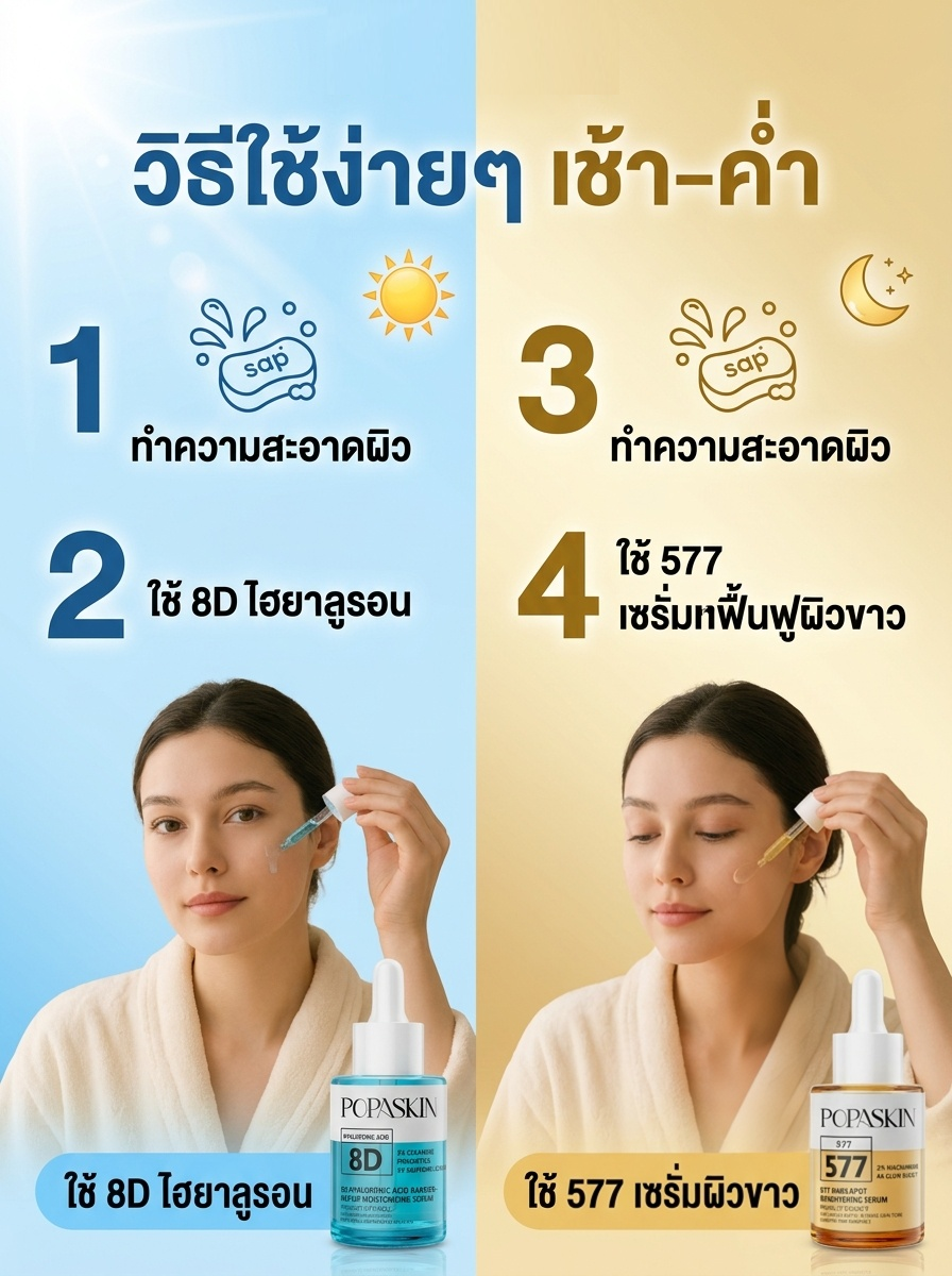 - หลังทำความสะอาดผิวหน้า ทาเซรั่ม 577 (ขวดเหลือง) ให้ทั่ว ใบหน้าและลำคอ