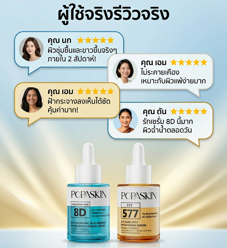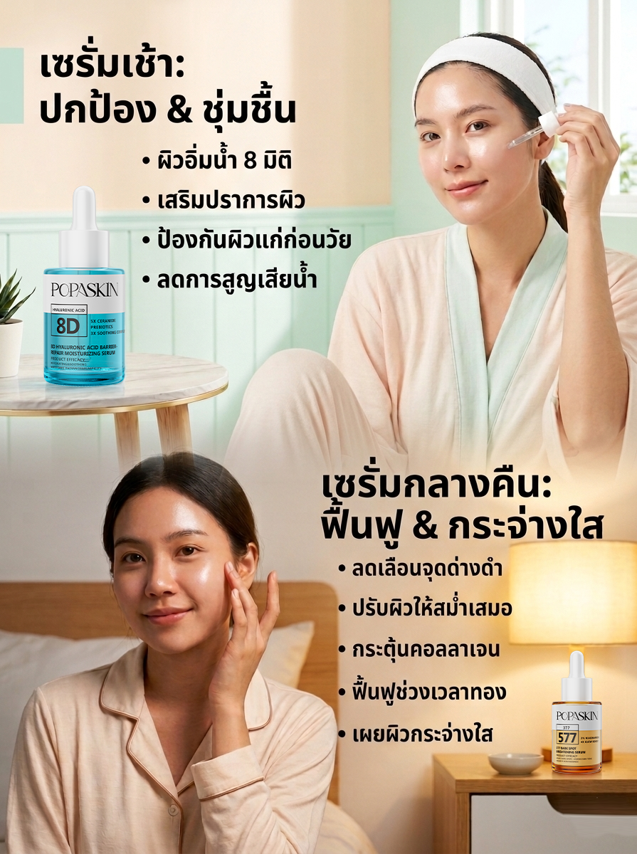- ตามด้วยเชรั่ม 8D (ขวดฟ้า) เพื่อเติมความชุ่มชึ่นและปิดล็อก การบารุง