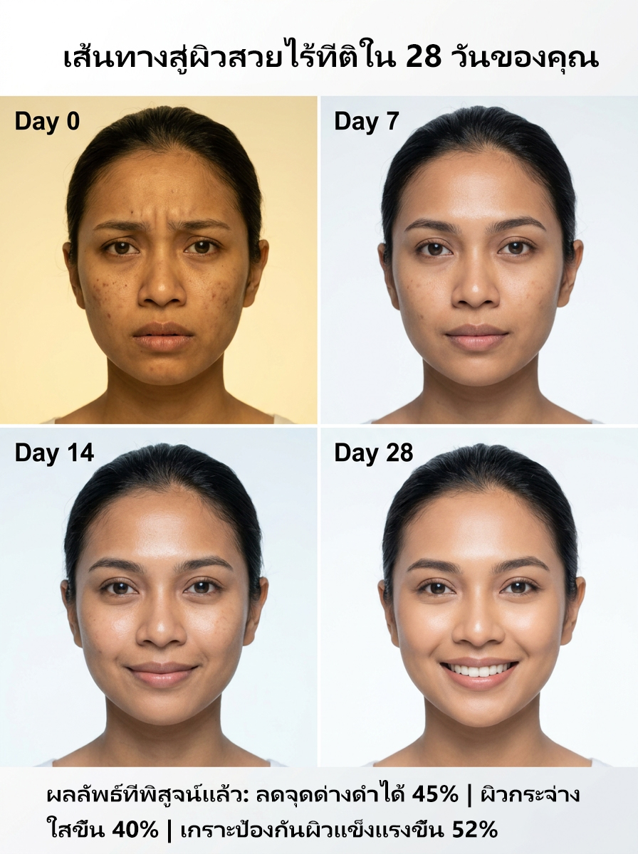- ทาครีมกันแดด: เป็นขั้นตอนที่สำคัญที่สุดในตอนเช้าเพื่อ ปกป้องผิวและป้องกันการเกิดจุดต่างดำเพิ่ม