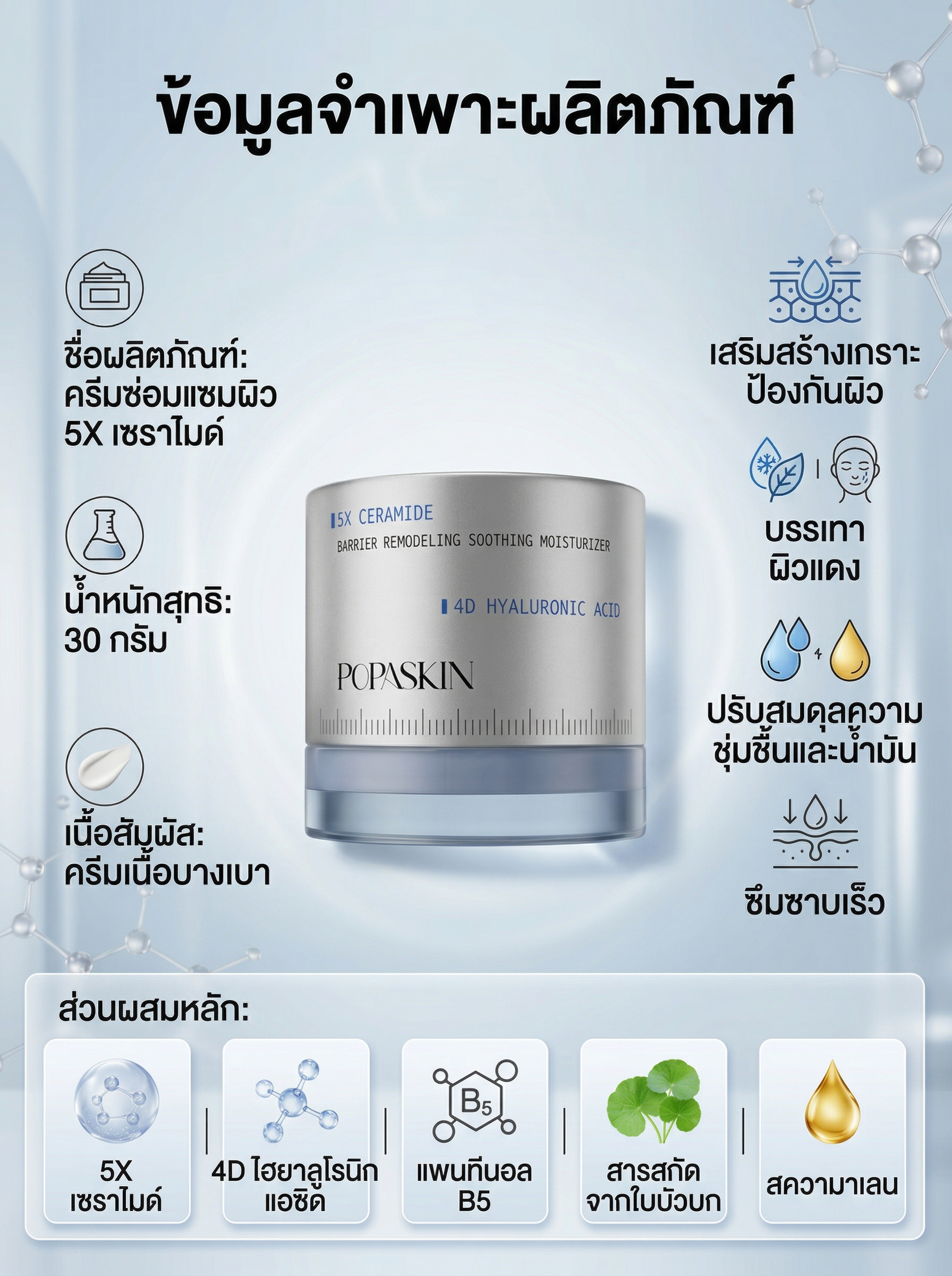 - ส่วนประกอบสำคัญ:5X Ceramides (NP. AS, NS, AP. EOP), 4D Hyaluronic Acid, Centella Asiatica (สารสกัดใบ บัวบก), Panthenol (วิตามินบี 5)