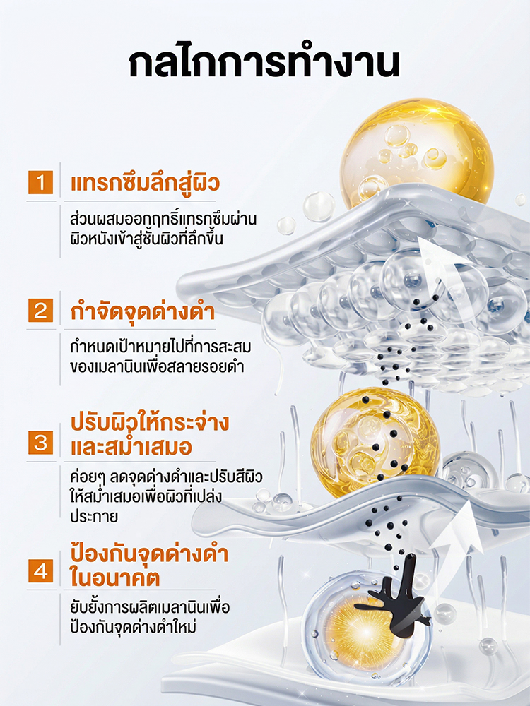 - ส่วนประกอบสำคัญ:577 (4-Butylresorcinol) & 377 (SymWhite 377)Niacinamide, Alpha-Arbutin, Tranexamic Acid, Vitamin C Derivatives, Pearl Extract