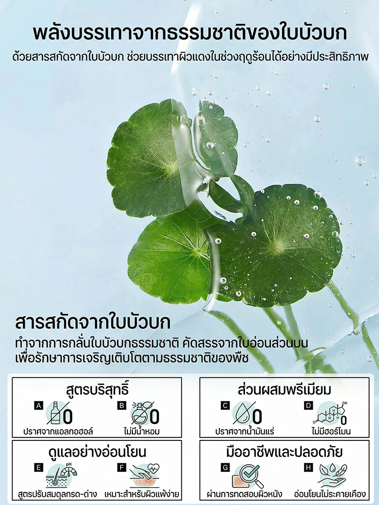 - ปลอบประโลมผิว: ด้วย Centella Asiatica และ Panthenol ลดการระคายเคืองและรอยแดง